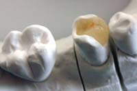 Inlays Inlays sind Füllungen die aus Kunststoff, Keramik oder Metall gefertigt werden können. Ist nach Entfernen von Karies noch ausreichend eigene Zahnsubstanz vorhanden, kann dieser Defekt mit einem Inlay geschlossen werden. |