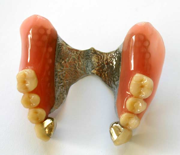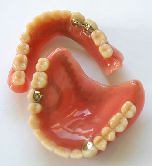 herausnehmbare Prothese mit dem Restgebiss verbunden.